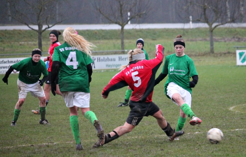 Am Samstagnachmittag hatten die Frauen aus Granheim den SV Unlingen zu Gast. Auf einem leicht weiß geflockten Platz pfiff der Schiri das Spiel pünktlich an. Beide Mannschaften nahmen den Kampf auf dem immer schmieriger werdenden Platz an. Bei den kalten Temperaturen freuten sich die zahlreich erschienenen Zuschauer besonders, als unser Ingi den Glühweinpott auspackte. So wurde es nicht nur den Spielerinnen auf dem Platz langsam warm, sondern auch unseren treuen Fans. Das Spiel war jedoch die ersten 20 Minuten relativ ausgeglichen und beide Mannschaften brauchten Zeit, um sich abzutasten und auf dem Platz zurecht zu kommen. Unlingen tat sich auf Grund der schlechten Platzverhältnisse besonders schwer. In der 20. Minute bakam Stürmerin Steffi einen Schubser mit und wurde unsanft zu Fall gebracht. Der Freistoß war knapp vor dem Sechzehnmeterraum, daher eine perfekte Position für unsere Prinzessin zum schießen. Sabi Eisele schoss den Ball flach in Richtung langes Eck, doch der Ball wurde von einer Unlinger Spielerin in das kurze Eck abgefälscht und kugelte ins Tor. Das 1:0 für den SV Granheim! Ab dem 1:0 war Granheim am Drücker. Die Abwehr stand gut und Lu und ihre Hintermannschaft konnten die Gegenangriffe stets klären. Kurz vor der Halbzeitpause konnte Nancy Oßwald erfolgreich nachsetzen und den verunsicherten Abwehrspielerinnen aus Unlingen den Ball in deren eigener Hälfte abnehmen und zum verdienten 2:0 verwandeln. Die Freude war groß und Granheim konnte mit der 2:0 Führung in die Halbzeit gehen.